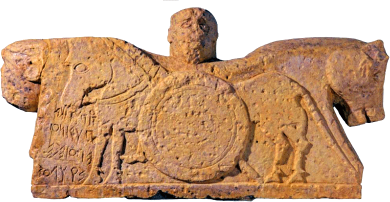 calcarea raffigurante un guerriero armato, con una scritta